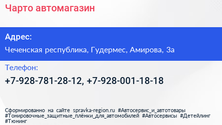 Чарто, автомагазин по адресу Чеченская республика, Гудермес, Амирова, 3а в дальнейшем Организация, размещена в следующих категориях: