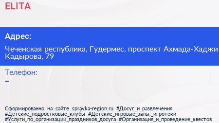ELITA по адресу Чеченская республика, Гудермес, проспект Ахмада-Хаджи Кадырова, 79 в дальнейшем Организация, размещена в следующих категориях: