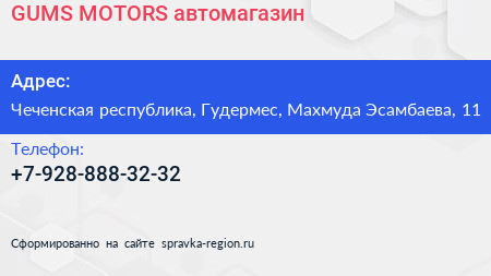 GUMS-MOTORS, автомагазин по адресу Чеченская республика, Гудермес, Махмуда Эсамбаева, 11 в дальнейшем Организация, размещена в следующих категориях: