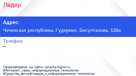 Лидер по адресу Чеченская республика, Гудермес, Бисултанова, 128а в дальнейшем Организация, размещена в следующих категориях: