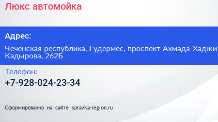 Люкс, автомойка по адресу Чеченская республика, Гудермес, проспект Ахмада-Хаджи Кадырова, 262Б в дальнейшем Организация, размещена в следующих категориях: