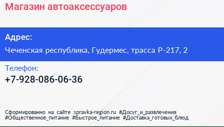 Магазин автоаксессуаров по адресу Чеченская республика, Гудермес, трасса Р-217, 2 в дальнейшем Организация, размещена в следующих категориях: