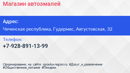 Магазин автоэмалей по адресу Чеченская республика, Гудермес, Августовская, 32 в дальнейшем Организация, размещена в следующих категориях:
