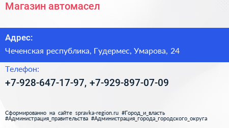 Магазин автомасел по адресу Чеченская республика, Гудермес, Умарова, 24 в дальнейшем Организация, размещена в следующих категориях: