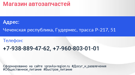 Магазин автозапчастей по адресу Чеченская республика, Гудермес, трасса Р-217, 51 в дальнейшем Организация, размещена в следующих категориях: