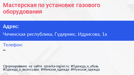 Мастерская по установке газового оборудования по адресу Чеченская республика, Гудермес, Идрисова, 1а в дальнейшем Организация, размещена в следующих категориях: