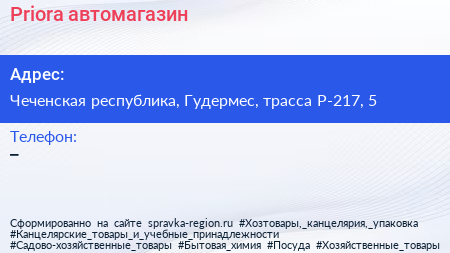 Priora, автомагазин по адресу Чеченская республика, Гудермес, трасса Р-217, 5 в дальнейшем Организация, размещена в следующих категориях: