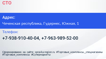 СТО по адресу Чеченская республика, Гудермес, Южная, 1 в дальнейшем Организация, размещена в следующих категориях: