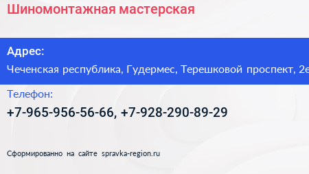 Шиномонтажная мастерская по адресу Чеченская республика, Гудермес, Терешковой проспект, 2е в дальнейшем Организация, размещена в следующих категориях: