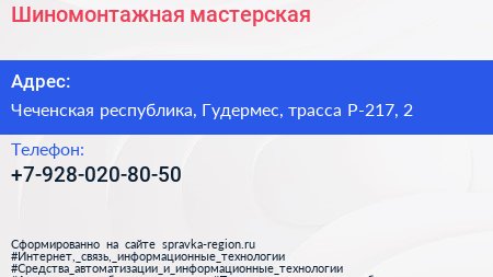 Шиномонтажная мастерская по адресу Чеченская республика, Гудермес, трасса Р-217, 2 в дальнейшем Организация, размещена в следующих категориях: