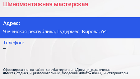 Шиномонтажная мастерская по адресу Чеченская республика, Гудермес, Кирова, 64 в дальнейшем Организация, размещена в следующих категориях: