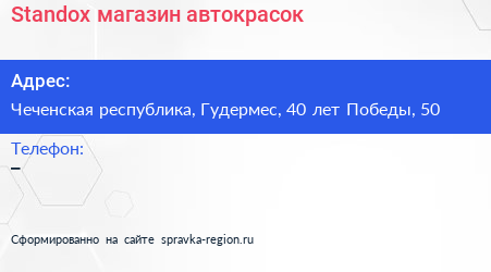 Standox, магазин автокрасок по адресу Чеченская республика, Гудермес, 40 лет Победы, 50 в дальнейшем Организация, размещена в следующих категориях: