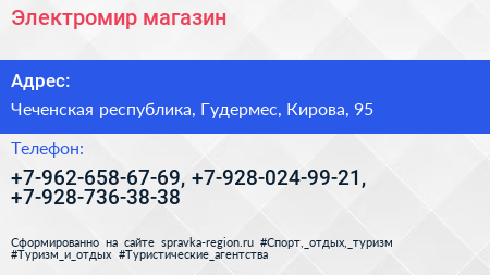 Электромир, магазин по адресу Чеченская республика, Гудермес, Кирова, 95 в дальнейшем Организация, размещена в следующих категориях: