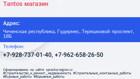 Tantos, магазин по адресу Чеченская республика, Гудермес, Терешковой проспект, 18Б в дальнейшем Организация, размещена в следующих категориях: