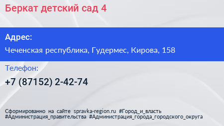 Беркат, детский сад №4 по адресу Чеченская республика, Гудермес, Кирова, 158 в дальнейшем Организация, размещена в следующих категориях: