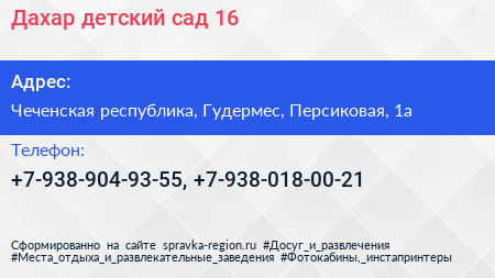 Дахар, детский сад №16 по адресу Чеченская республика, Гудермес, Персиковая, 1а в дальнейшем Организация, размещена в следующих категориях:
