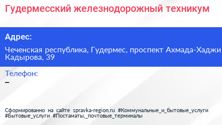 Гудермесский железнодорожный техникум по адресу Чеченская республика, Гудермес, проспект Ахмада-Хаджи Кадырова, 39 в дальнейшем Организация, размещена в следующих категориях: