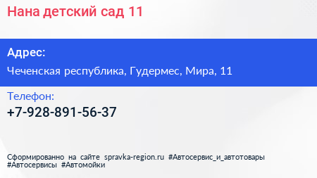 Нана, детский сад №11 по адресу Чеченская республика, Гудермес, Мира, 11 в дальнейшем Организация, размещена в следующих категориях: