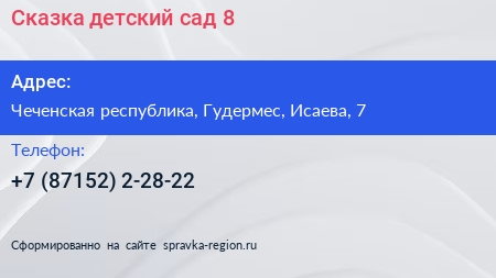 Сказка, детский сад №8 по адресу Чеченская республика, Гудермес, Исаева, 7 в дальнейшем Организация, размещена в следующих категориях: