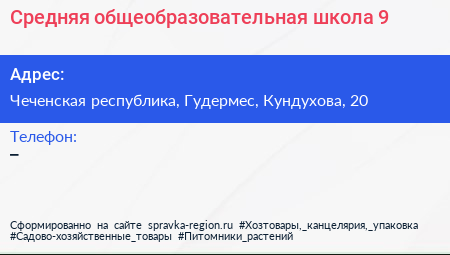 Средняя общеобразовательная школа №9 по адресу Чеченская республика, Гудермес, Кундухова, 20 в дальнейшем Организация, размещена в следующих категориях: