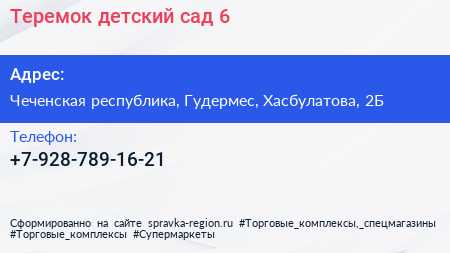 Теремок, детский сад №6 по адресу Чеченская республика, Гудермес, Хасбулатова, 2Б в дальнейшем Организация, размещена в следующих категориях: