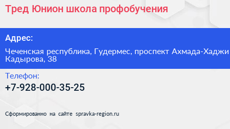 Тред-Юнион, школа профобучения по адресу Чеченская республика, Гудермес, проспект Ахмада-Хаджи Кадырова, 38 в дальнейшем Организация, размещена в следующих категориях: