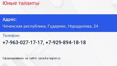 Юные таланты по адресу Чеченская республика, Гудермес, Нурадилова, 24 в дальнейшем Организация, размещена в следующих категориях: