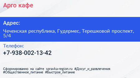 Арго, кафе по адресу Чеченская республика, Гудермес, Терешковой проспект, 5/4 в дальнейшем Организация, размещена в следующих категориях: