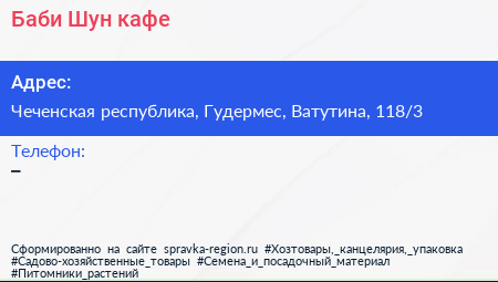 Баби Шун, кафе по адресу Чеченская республика, Гудермес, Ватутина, 118/3 в дальнейшем Организация, размещена в следующих категориях: