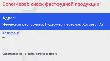 DonerKebab, киоск фастфудной продукции по адресу Чеченская республика, Гудермес, переулок Хатаева, 7а в дальнейшем Организация, размещена в следующих категориях: