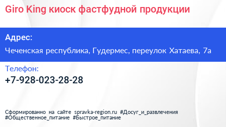 Giro King, киоск фастфудной продукции по адресу Чеченская республика, Гудермес, переулок Хатаева, 7а в дальнейшем Организация, размещена в следующих категориях: