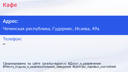 Кафе по адресу Чеченская республика, Гудермес, Исаева, 49а в дальнейшем Организация, размещена в следующих категориях:
