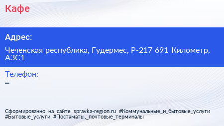 Кафе по адресу Чеченская республика, Гудермес, Р-217 691 Километр, АЗС1 в дальнейшем Организация, размещена в следующих категориях: