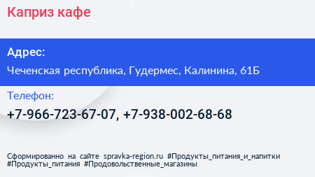 Каприз, кафе по адресу Чеченская республика, Гудермес, Калинина, 61Б в дальнейшем Организация, размещена в следующих категориях: