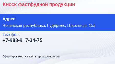 Киоск фастфудной продукции по адресу Чеченская республика, Гудермес, Школьная, 15а в дальнейшем Организация, размещена в следующих категориях: