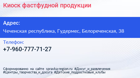 Киоск фастфудной продукции по адресу Чеченская республика, Гудермес, Белореченская, 38 в дальнейшем Организация, размещена в следующих категориях: