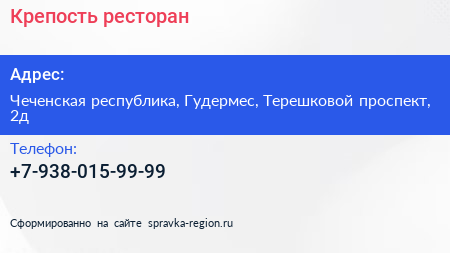 Крепость, ресторан по адресу Чеченская республика, Гудермес, Терешковой проспект, 2д в дальнейшем Организация, размещена в следующих категориях: