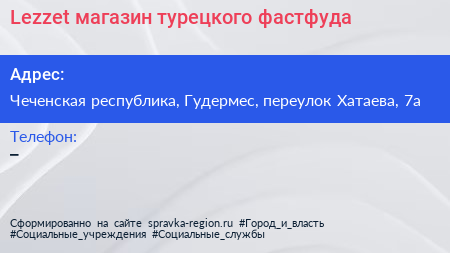 Lezzet, магазин турецкого фастфуда по адресу Чеченская республика, Гудермес, переулок Хатаева, 7а в дальнейшем Организация, размещена в следующих категориях:
