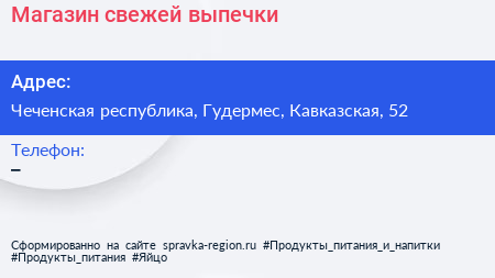 Магазин свежей выпечки по адресу Чеченская республика, Гудермес, Кавказская, 52 в дальнейшем Организация, размещена в следующих категориях: