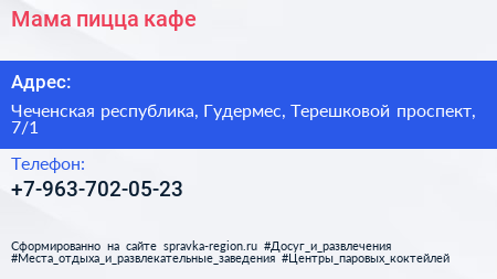 Мама-пицца, кафе по адресу Чеченская республика, Гудермес, Терешковой проспект, 7/1 в дальнейшем Организация, размещена в следующих категориях: