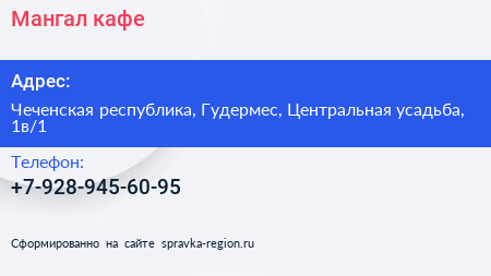 Мангал, кафе по адресу Чеченская республика, Гудермес, Центральная усадьба, 1в/1 в дальнейшем Организация, размещена в следующих категориях: