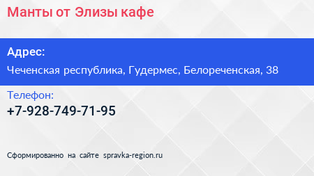 Манты от Элизы, кафе по адресу Чеченская республика, Гудермес, Белореченская, 38 в дальнейшем Организация, размещена в следующих категориях: