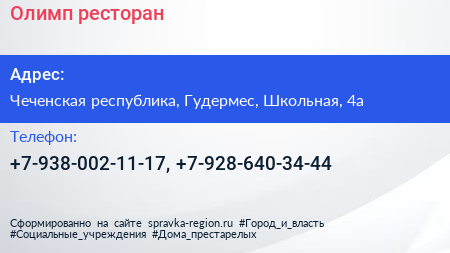 Олимп, ресторан по адресу Чеченская республика, Гудермес, Школьная, 4а в дальнейшем Организация, размещена в следующих категориях: