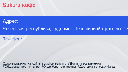 Sakura, кафе по адресу Чеченская республика, Гудермес, Терешковой проспект, 18 в дальнейшем Организация, размещена в следующих категориях: