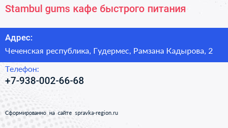 Stambul gums, кафе быстрого питания по адресу Чеченская республика, Гудермес, Рамзана Кадырова, 2 в дальнейшем Организация, размещена в следующих категориях: