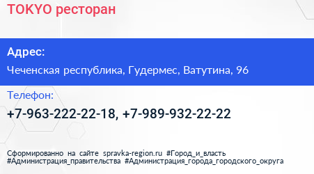 TOKYO, ресторан по адресу Чеченская республика, Гудермес, Ватутина, 96 в дальнейшем Организация, размещена в следующих категориях: