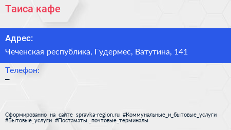 Таиса, кафе по адресу Чеченская республика, Гудермес, Ватутина, 141 в дальнейшем Организация, размещена в следующих категориях:
