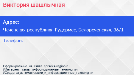 Виктория, шашлычная по адресу Чеченская республика, Гудермес, Белореченская, 36/1 в дальнейшем Организация, размещена в следующих категориях: