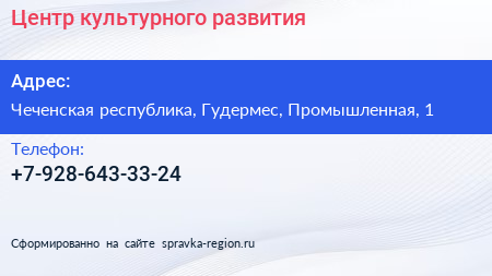 Центр культурного развития по адресу Чеченская республика, Гудермес, Промышленная, 1 в дальнейшем Организация, размещена в следующих категориях:
