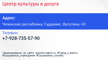 Центр культуры и досуга по адресу Чеченская республика, Гудермес, Ватутина, 43 в дальнейшем Организация, размещена в следующих категориях: